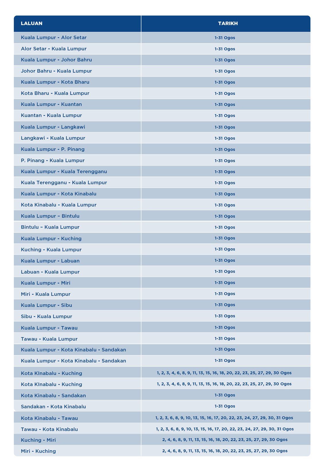 *Jadual penerbangan di atas akan berubah bergantung kepada permintaan pelanggan dan peraturan pemerintah.
